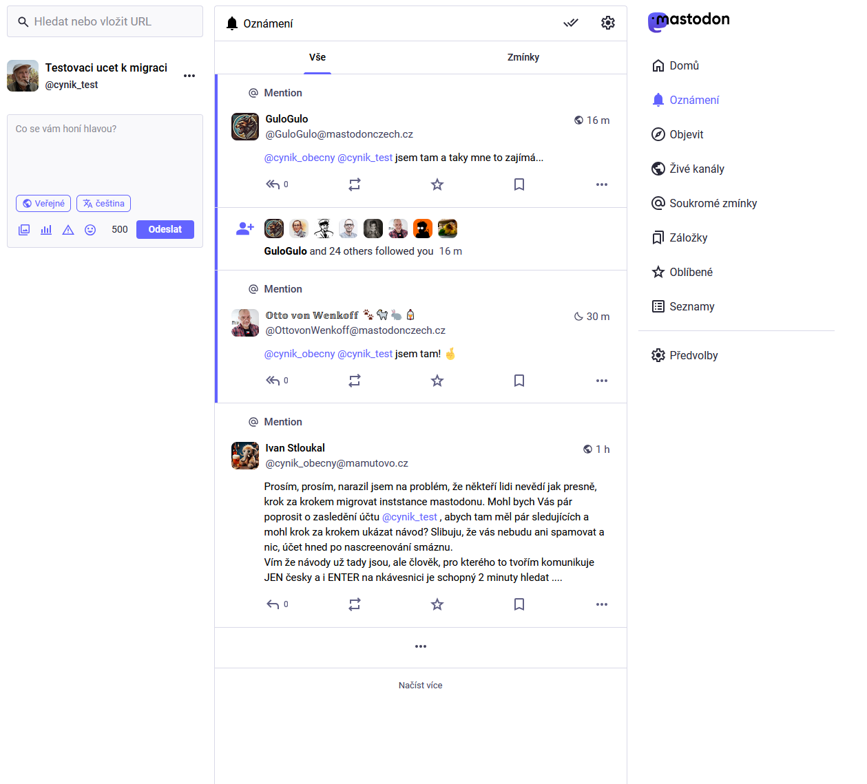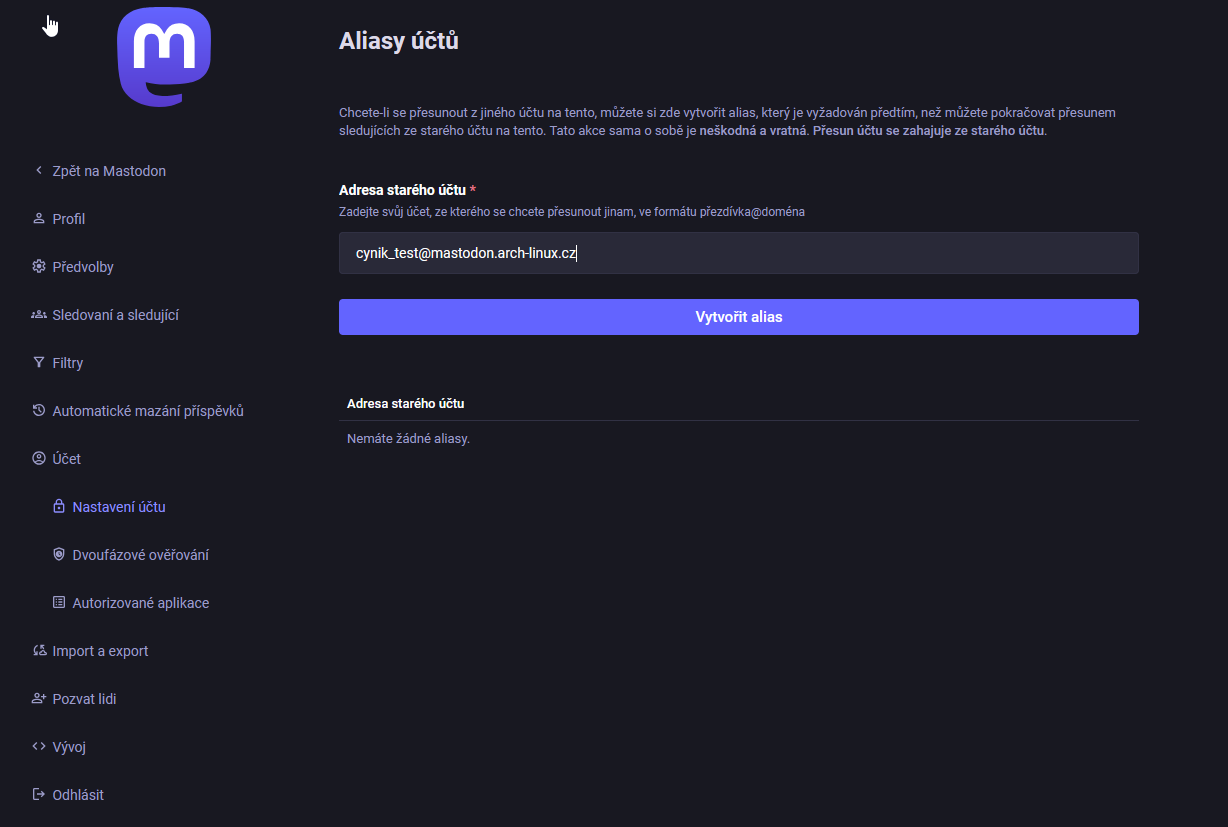 Abychom se v tom vyznali, uděláme to takto. Budeme přenášet účet @cynik_test@mastodon-arch-linux.cz na účet @novystastnyuzivatel@mamutovo.cz .