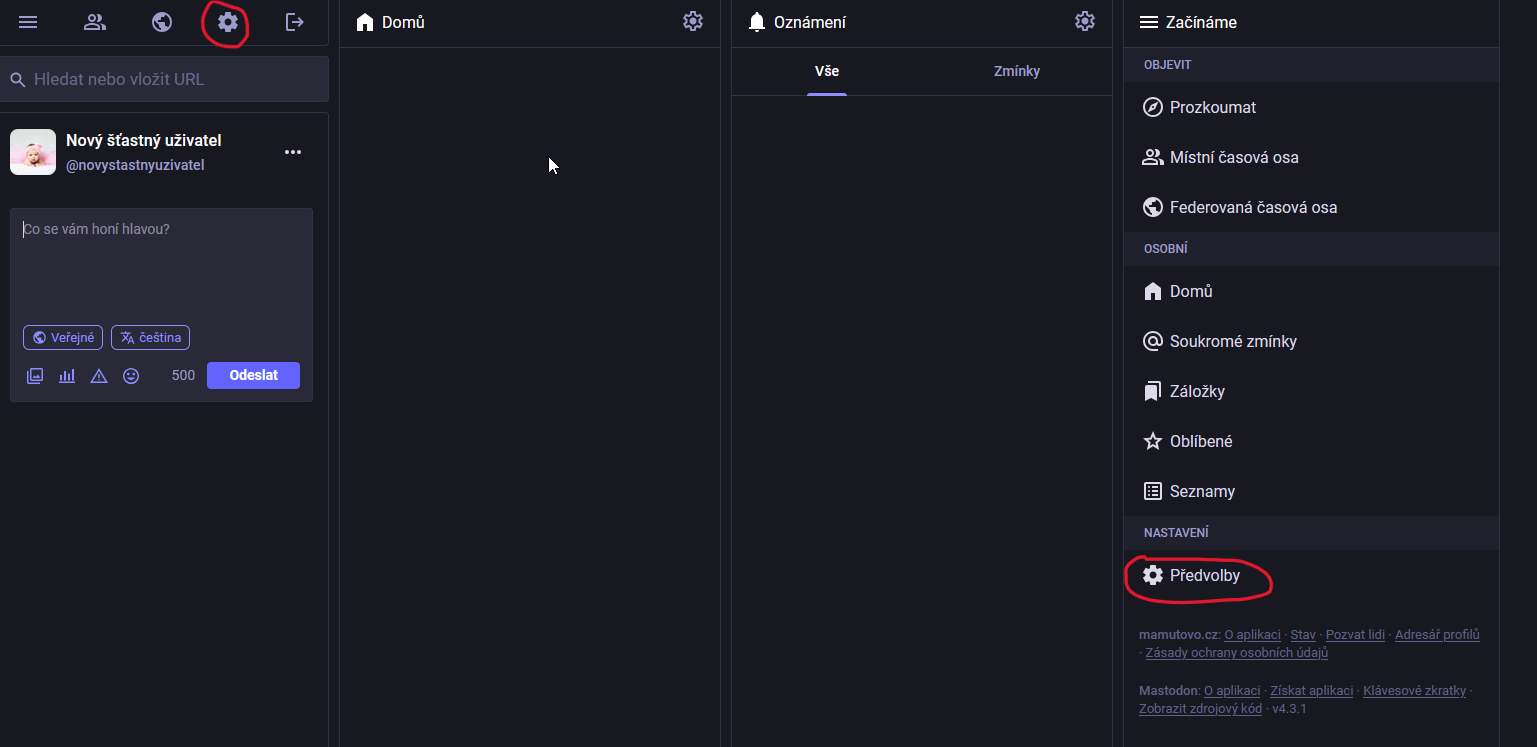 Otevřete si novou instanci Mastodonu a pojďte do nastavení - pomocí ikony ozubeného kola ve sloupci profilu nebo v menu přes Předvolby.
