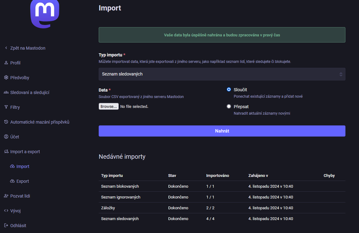 Vzhledem k tomu, že jsem se setkal s dotazem na to, jak přenést Mastodon účet z jednoho serveru na druhý a nepřijít o sledující/sledované/seznamy a podobně, rozhodl jsem se pro vás vyrobit opravdu Krok za krokem návod. Pro ty, kdo jsou zdatní v práci s počítačem doporučím nějaký zjednodušený návod, tento bude tvořený pro člověka, který i Enter na klávesnici dokáže hledat dvě minuty.