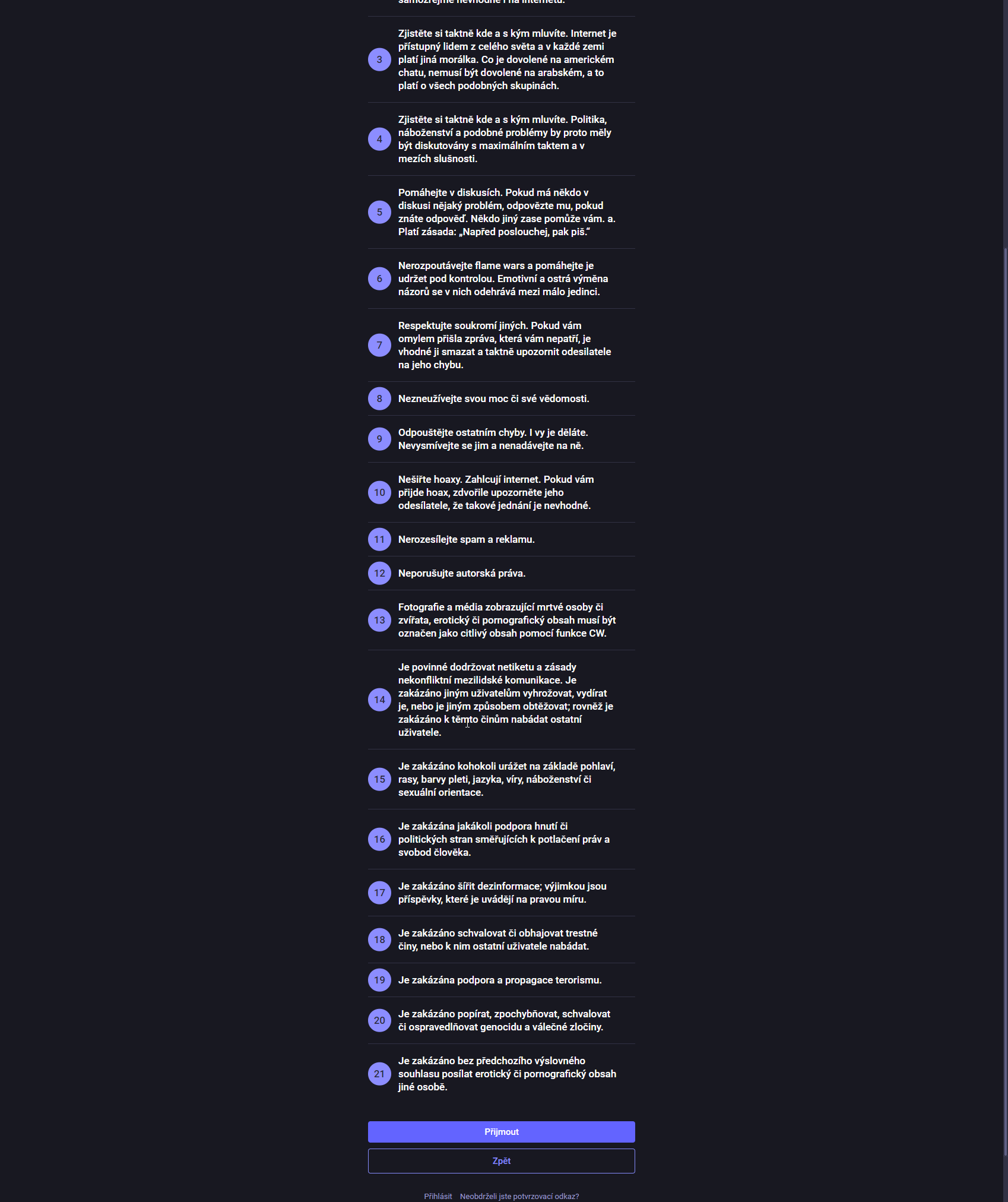 Odtud se dostanete na stránku s podmínkami instance. Doporučuji přečíst, abyste se vyvarovali případným problémům v budoucnosti. Na konci už jen kliknout na Přijmout.