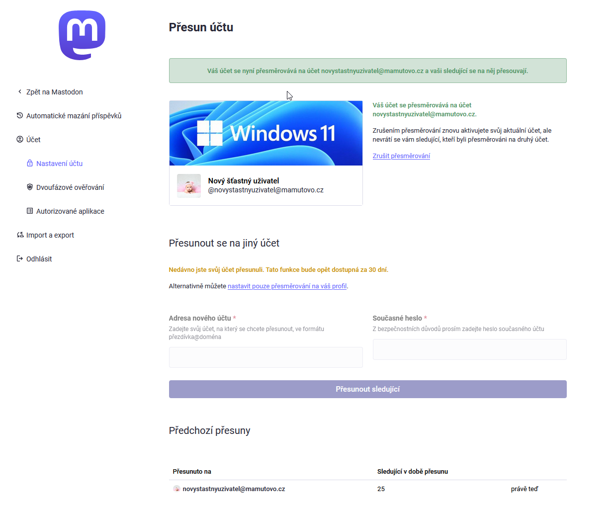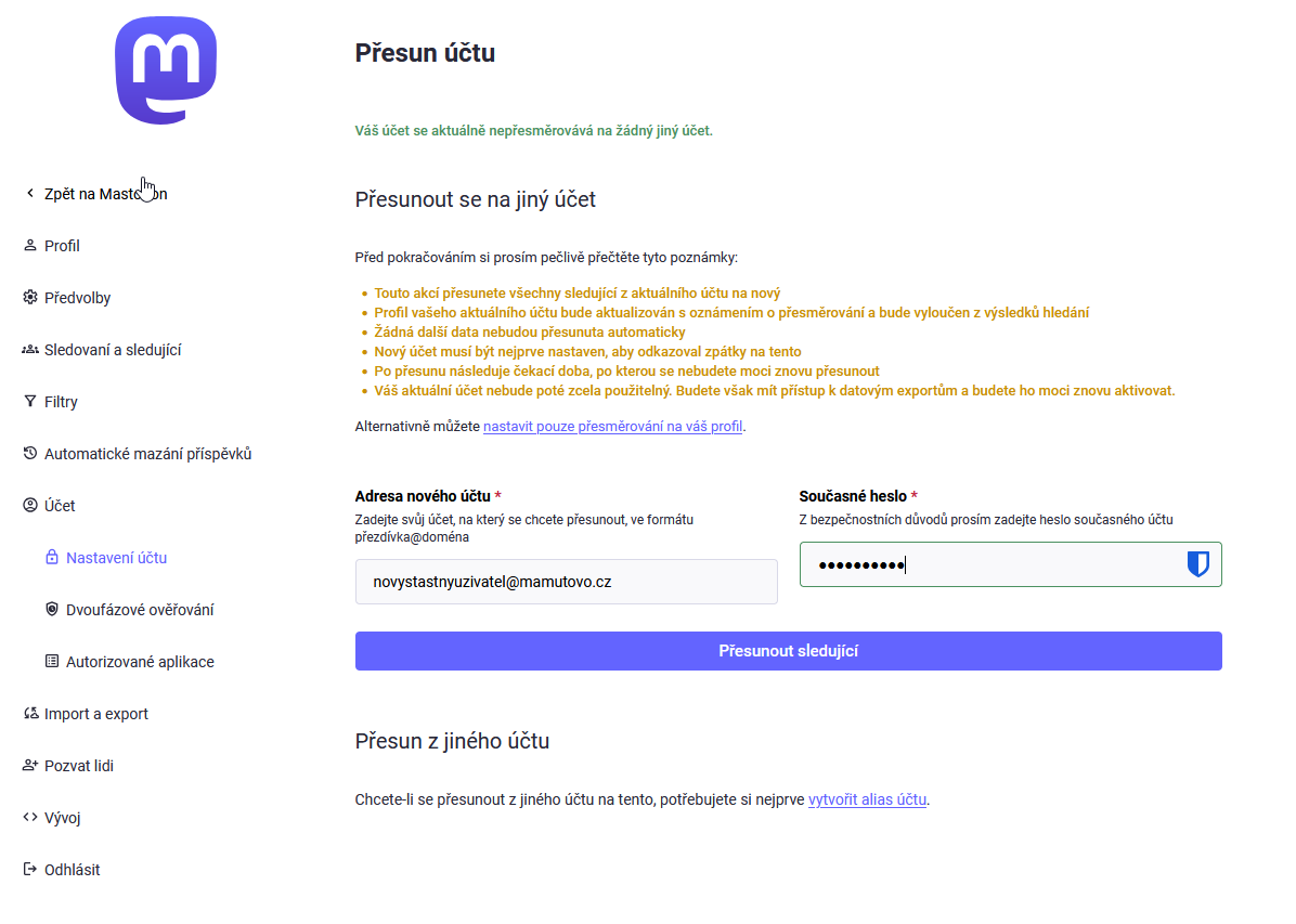 Zadejte Adresu nového účtu - handle nového účtu (v mém případě novystastnyuzivatel@mamutovo.cz), vaše heslo k původnímu (starému) účtu a potvrďte Přesunout sledující