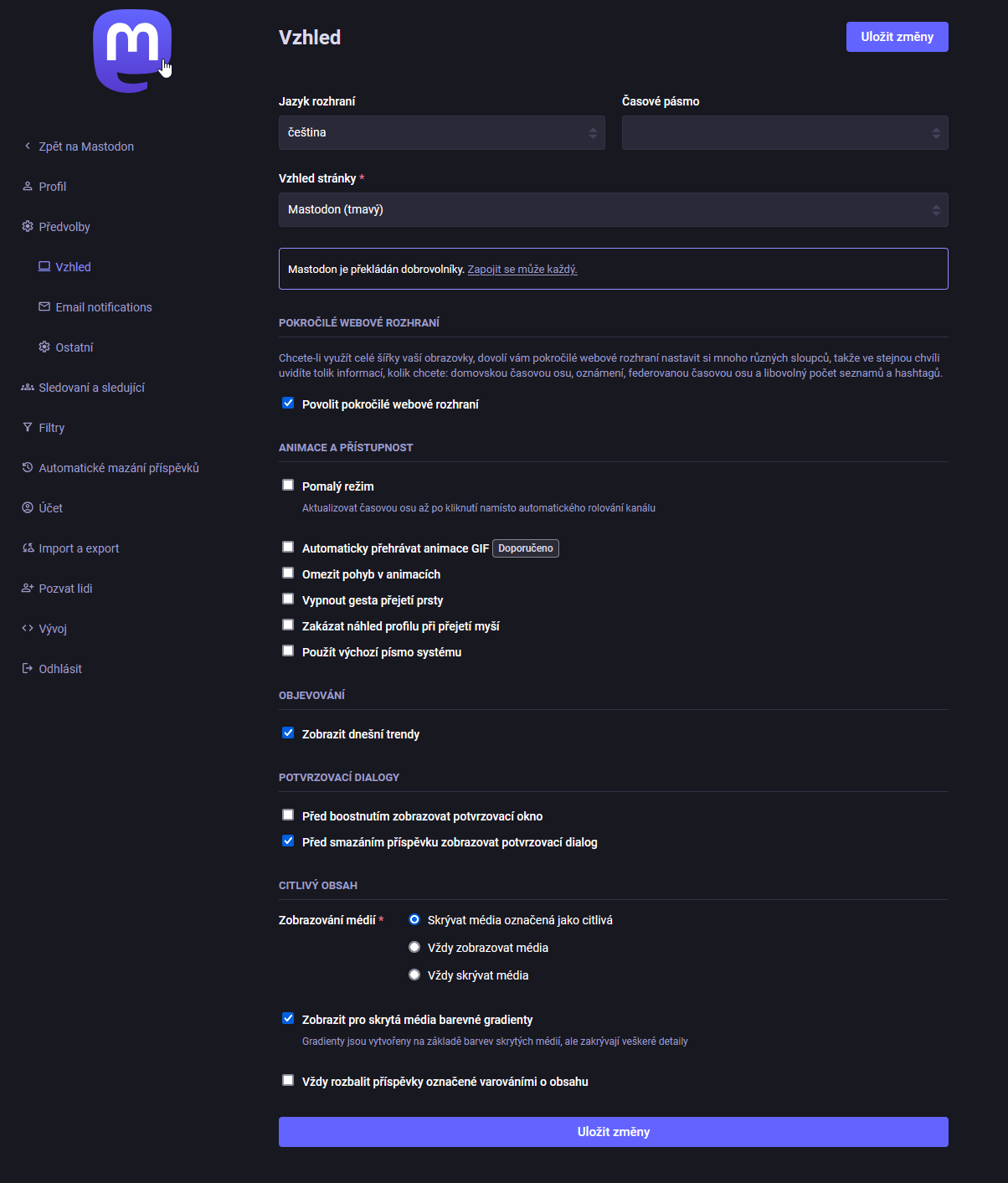 Zbytek nastavení si projdeme příště, ale vzhledem k tomu, že přecházíte z jiné instance, máte to v malíku. Jedné co na novém profilu doporučuji nastavit hned a nezapomenout je na kartě Soukromí a dosah nastavit viditelnost příspěvků ve vyhledávání a viditelnost profilu a zase samozřejmě Uložit.